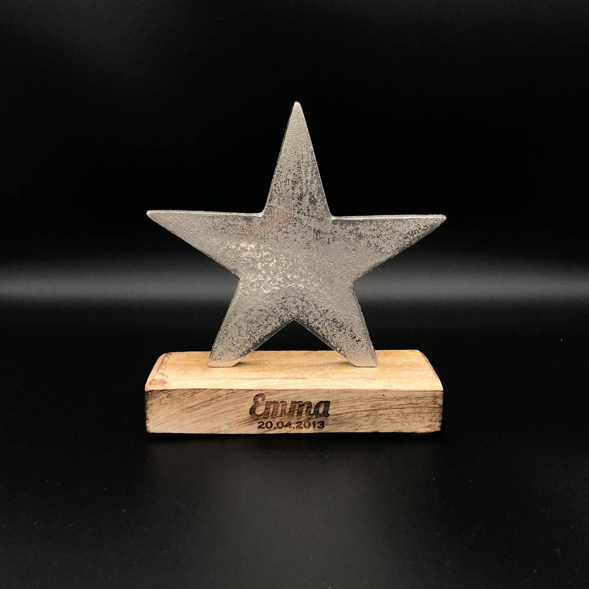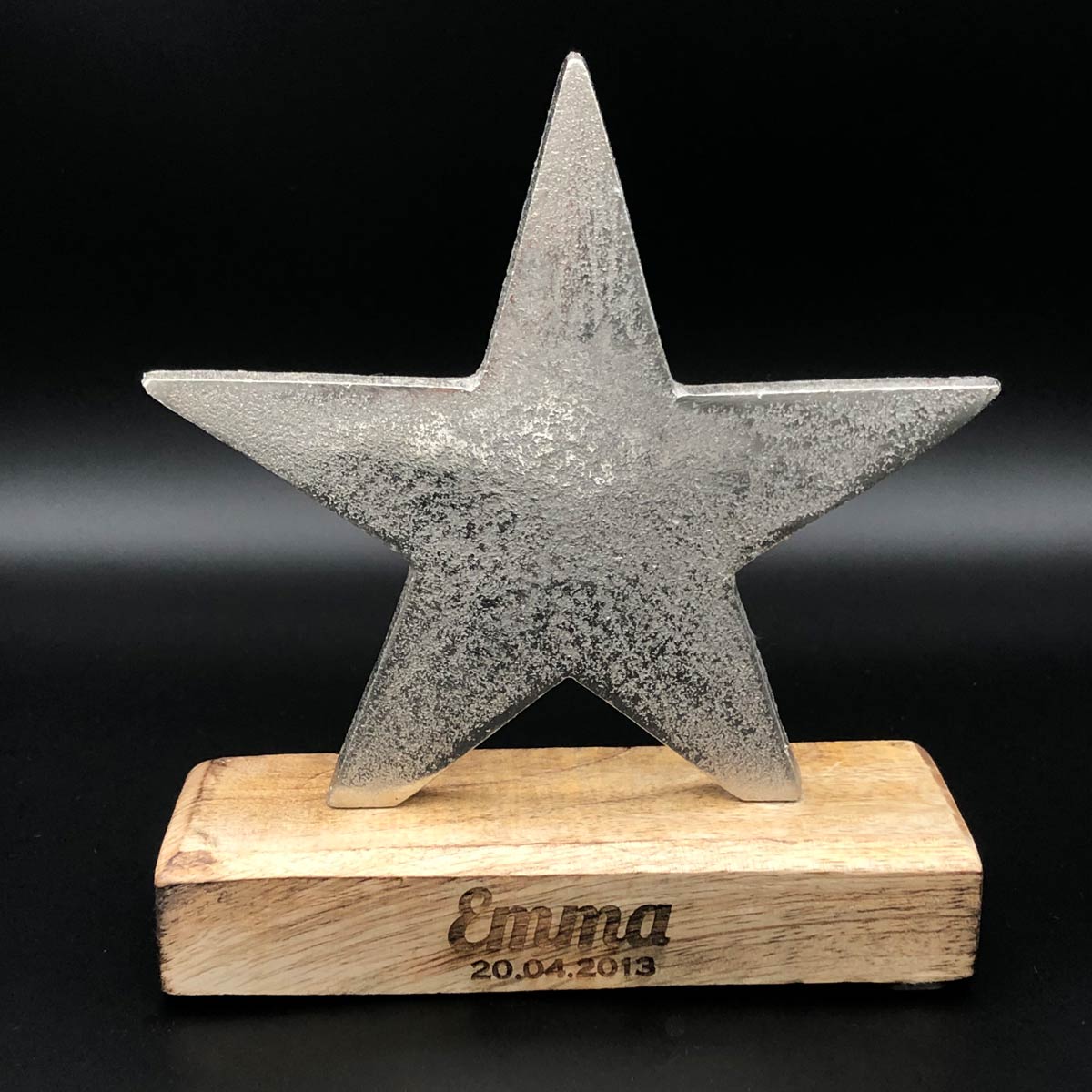 Der Stern-Aufsteller ist ein dekoratives Wohnaccessoire: Er besteht aus massivem Metall und der Sockel aus wunderschönem Mangoholz, in das der Sternname ihres Sterns, sowie das Taufdatum eingraviert werden.