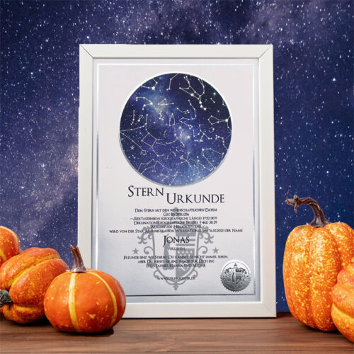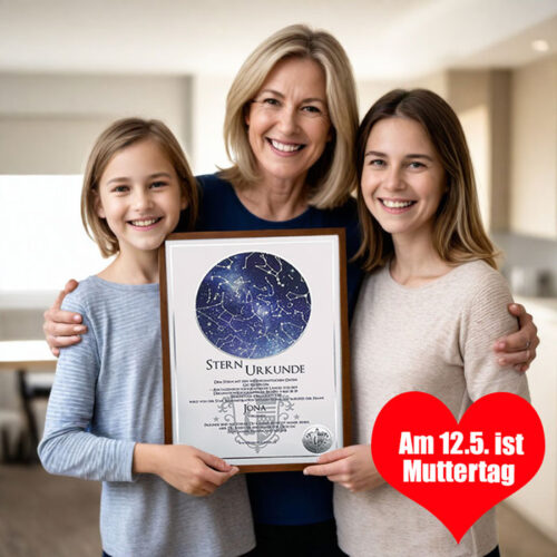 Die Sternurkunde ist das Herzstück der Sterntaufe: Sie dokumentiert ihren persönlichen Eintrag in das internationale S.A.I.-Sternregister®. Neben dem von Ihnen gewählten Sternnamen und dem Taufdatum sind auch die wissenschaftlichen Daten und Koordinaten Ihres Sterns auf der Urkunde angegeben. Optional können Sie Ihrer Sternurkunde auch eine persönliche Widmung hinzufügen – natürlich kostenlos.