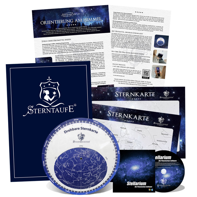 Mit der professionellen Software „Stellarium“ erhalten Sie ein vollwertiges Planetarium für Ihren PC, mit dem Sie den Sternenhimmel zu einem beliebig einstellbaren Zeitpunkt von Ihrem heimischen Computer betrachten können. Auch Ihren eigenen Stern können Sie sich mit der Software anzeigen lassen und sich am Sternenhimmel auf Erkundungstour begeben. Die Software erhalten Sie auf CD-Rom für PC und MAC.