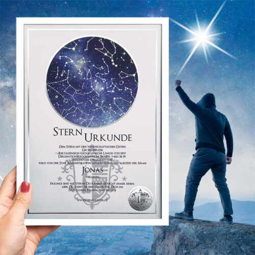 Die Sternurkunde ist das Herzstück der Sterntaufe: Sie dokumentiert ihren persönlichen Eintrag in das internationale S.A.I.-Sternregister®. Neben dem von Ihnen gewählten Sternnamen und dem Taufdatum sind auch die wissenschaftlichen Daten und Koordinaten Ihres Sterns auf der Urkunde angegeben. Optional können Sie Ihrer Sternurkunde auch eine persönliche Widmung hinzufügen – natürlich kostenlos.
