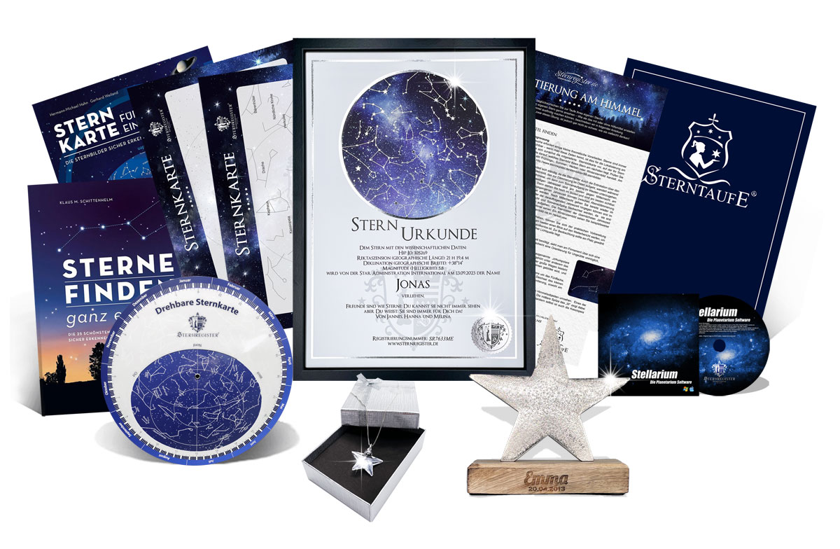 Zur Grundausstattung eines jeden Sterntaufe-Pakets gehören Ihre persönliche Sternurkunde, zwei Sternkarten mit der genauen Position Ihres Sterns am Himmel und eine Anleitung, die Ihnen erklärt, wie sie Ihren Stern am Himmel finden können. Ihren Stern verschenken Sie, indem Sie dem Beschenkten diese Dokumente überreichen. Neben dieser Ausstattung gibt es noch diverses weiteres Zubehör, das sie mit Ihrer Sterntaufe verschenken können. Neben einer Rahmung und Schmuck zur Sterntaufe bieten wir auch verschiedene Sterntrophäen zur Sterntaufe an, die sie mit Ihrem Stern schenken können.